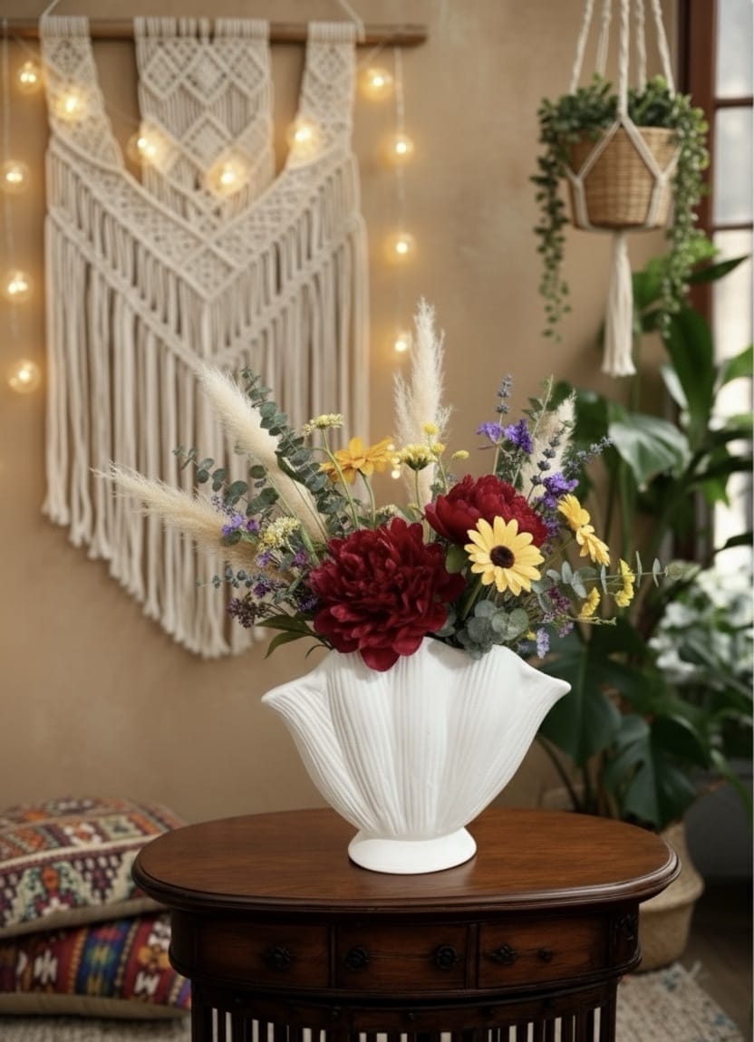 Bu eşsiz seramik vazo, deniz kabuğundan ilham alan dalgalı ve zarif tasarımıyla evinize doğal bir dokunuş katacak. Beyaz ve mat yüzeyi, her türlü dekorasyon stiline kolayca uyum sağlar. Küçük boyutuyla konsol, sehpa veya raf gibi alanlar için idealdir.