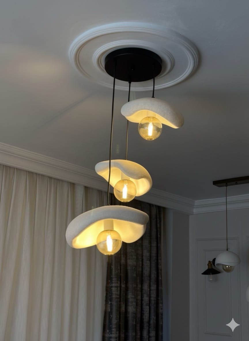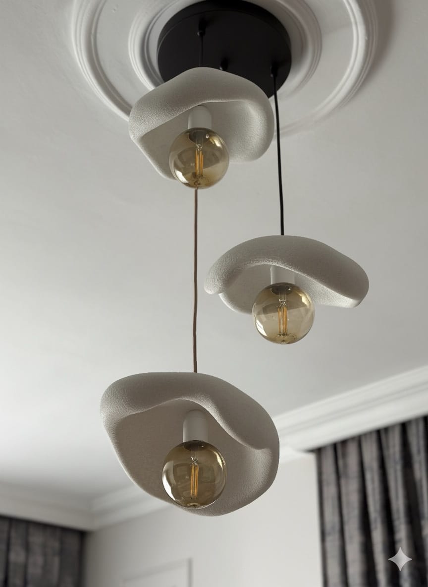Leaf Avize, modern minimalizm ile doğal organik hatların estetik buluşması. üçlü beton görünümlü başlık tasarımıyla yaşam alanlarınıza zarif bir dokunuş katar. Üçlü sarkıt formu, hem işlevsel aydınlatma hem de dekoratif şıklık sağlar.